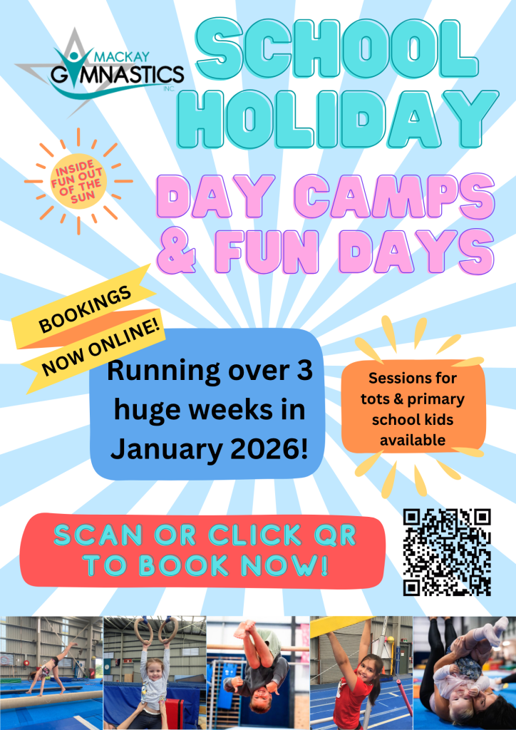 Mackay Gymnastics has a class for everyone and holiday programs are no different. Our holiday programs are run by accredited coaches who will set up and run fun gymnastics-based circuits so your child will get to try a wide range of fun activities in a safe learning environment. Whether you have never attended a class before or you attend every week, our holiday program is bound to be a FUN experience for all! If you have a child who wants to balance on beams, swing on bars, jump on a trampoline and play in our foam pit then book them in for one of our holiday programs. We run them most school holidays and always advertise them on Facebook and Instagram. Follow us to keep up to date with upcoming events!